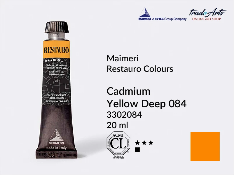 Wszystkie farby Restauro są maksymalnie światłoodporne. Farba Cadmium Yellow Deep jest kryjąca. Zawiera pigmenty: Cadmium Sulphide PY35. Grupa cenowa 3.