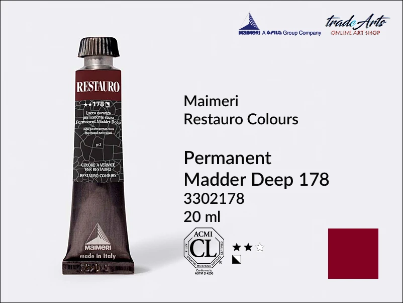 Wszystkie farby Restauro są maksymalnie światłoodporne. Farba Permanent Madder Deep jest półkryjąca. Zawiera pigmenty: Anthraquinone PR83, Sodium Polusulphide-Aminosilicate PV15. Grupa cenowa 2.