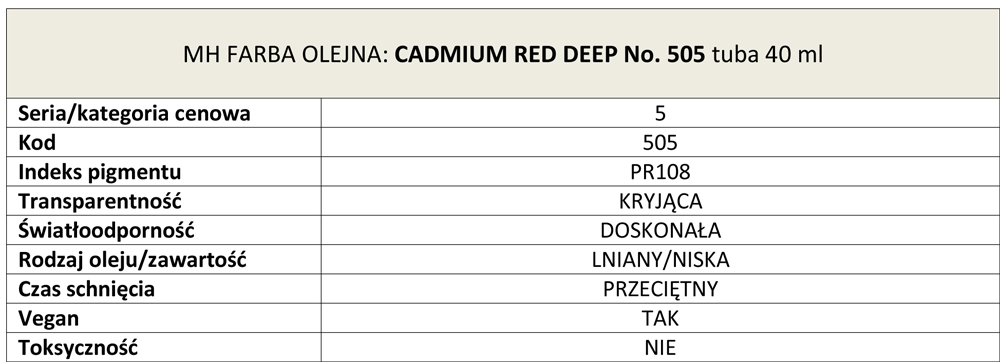 Cadmium Red Deep No. 505 - najgłębsza z serii kadmowych; ta czerwień ma wyraźne niebieskawe barwy, które dają piękne purpurowe odcienie.