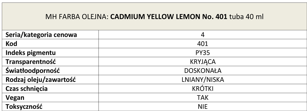 Cadmium Yellow Lemon No. 110 intensywnie żółty odcień siarczku kadmu. To nieorganiczny pigment, który rozjaśnia i zwiększa krycie ciepłych mieszanek, nie obalając ich. Gama pigmentów kadmowych została wprowadzona do produkcji w latach 1840-1890, gdy pozwalały na to koszty, i okazała się najbardziej artystycznie wiarygodna ze wszystkich związków metali odkrytych w XIX wieku.
