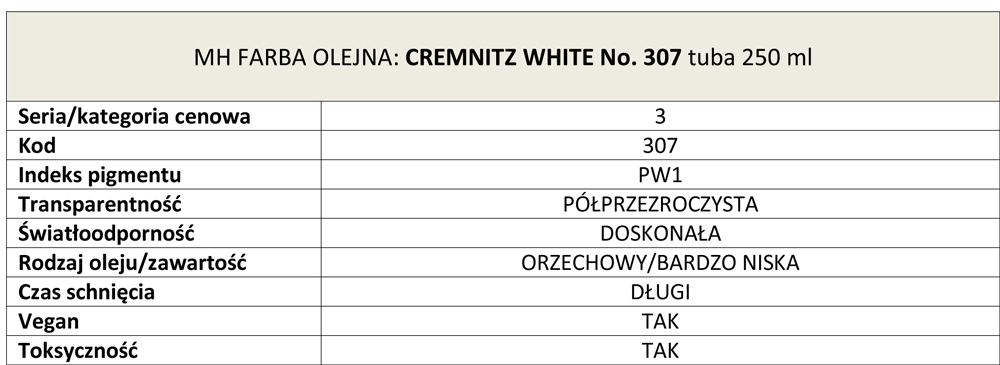 Farba olejna Artists Oil Colours Michael Harding, kolor: Cremnitz White No. 307 na oleju orzechowym, kartridż 250 ml