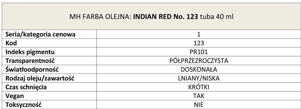 Indian Red No. 123 - to głębszy i chłodniejszy niebiesko-czerwony odcień syntetycznego tlenku żelaza. Jego gęstość kolorów tworzy refleksy z wyraźnie purpurowymi odcieniami, które niektórzy malarze cenią za oddawanie cielistych odcieni w oświetleniu wnętrz.