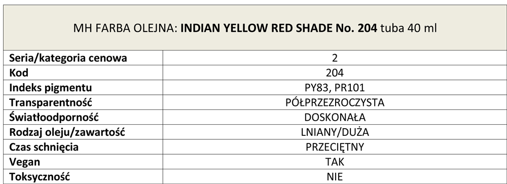 Indian Yellow Red Shade No. 204 to indyjska żółć z dodatkiem tlenku żelaza. Tlenek żelaza nadaje mieszance bogaty, piękny, rudy odcień, a także znacznie przyspiesza utwardzanie, co czyni tę farbę doskonałym utwardzaczem, gdy jest mieszana z innymi. Indian Yellow Red Shade jest wspaniały w połączeniu z magentą, ultramaryną i innymi żywymi kolorami.