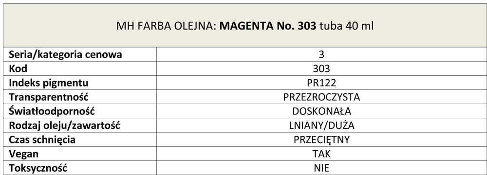 Magenta No. 303 - to odporny na światło pigment organiczny o silnych niebieskawych odcieniach, które prześwitują, jakby był używany jako glazura. Po przekształceniu w odcienie prezentuje wspaniałą gamę dekadenckich, mocnych, chłodnych różów przywodzących na myśl bogate satyny. W mieszankach z żółtymi lazurami uzyskujemy zakres uderzająco ciepłych, imbirowych pomarańczy lub zmieszany z przezroczystą czerwienią tlenkową, która naśladuje unikalne odcienie alizaryny. Aby uzyskać wspaniałe fiolety, zmieszaj Magenta No. 303 z Ultramarine Blue.
