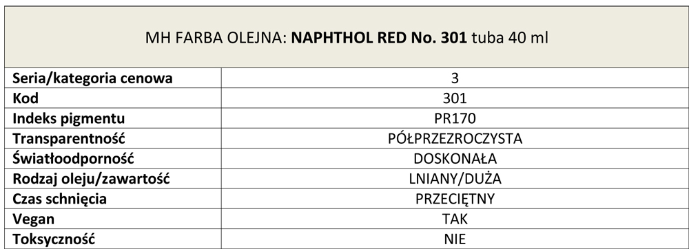 Naphthol Red No. 301- organiczny pigment, który może być stosowany jako przezroczysty lub kryjący, zgodnie z wyborem. W stanie niezmieszanym jest to czysta i lekko ognista czerwień o dużej sile zabarwienia i szeregu żółto-pomarańczowych odcieni. Te odcienie stają się zauważalne podczas nakładania pędzlem i dają znacznie jaśniejsze i cieplejsze róże niż te, które można uzyskać w przypadku czerwieni kadmowych. Po zmieszaniu z bielą, Naphthol Red No. 301 będzie wyglądał prawie jak fluorescencyjny.