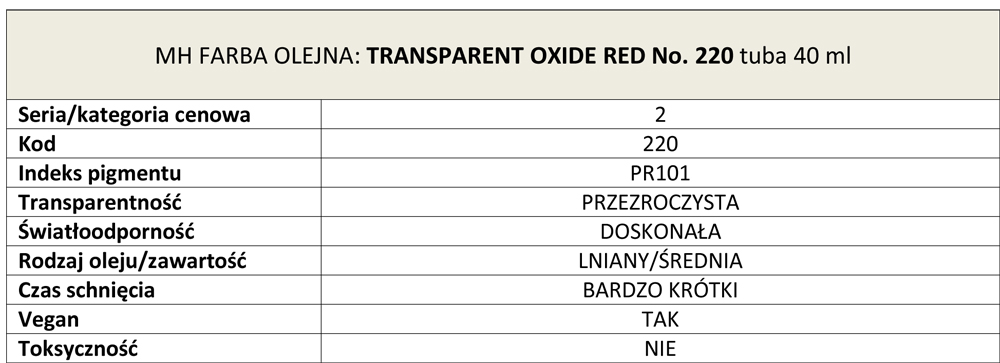 Transparent Oxide Red No. 220 - to tlenek żelaza wyprodukowany z tak małą cząsteczką pigmentu, że podobnie jak jego żółty odpowiednik, ma właściwości podobne do lazurów. Transparent Oxide Red No. 220 ma niesamowitą moc barwienia, która daje wspaniałe rezultaty w mieszankach z żółciami i dodaje grawitacji średnim odcieniom czerwieni. Zmieszaj go z błękitem ftalocyjaninowym, aby uzyskać ciekawe efekty.