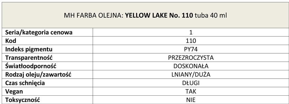 Yellow Lake No. 110 to jedno z najstarszych lazurów organicznych, Arylide Yellow. Jest to cieplejsza wersja Bright Yellow Lake, o podobnych właściwościach. Zwodniczo przezroczysty, ale o silnej mocy zabarwienia, przechodzi przez miksy z łagodniejszą i bardziej złocistą gamą subtonów.