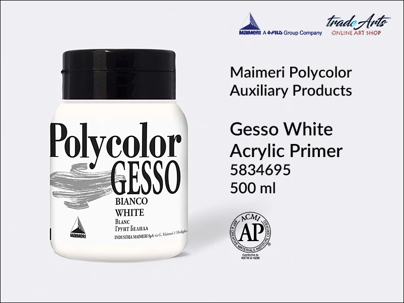 Szybkoschnąca biała pasta o doskonałej chłonności. Mieszanina drobno sproszkowanego weglanu wapnia, kleju, pigmentu i żywicy akrylowej. Białe gesso jest uniwersalnym podkładem akrylowym, charakteryzującym się trwałością, spoistością i dobrą siłą krycia. Produkt jest gotowy do użycia, lecz w razie potrzeby może być rozcieńczony wodą.