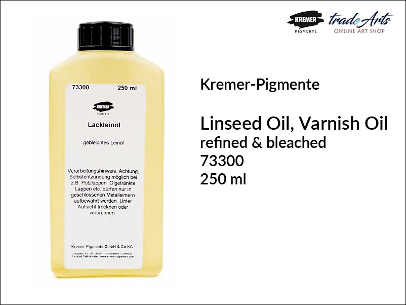 Specjalnie oczyszczony olej lniany-werniks (rafinowany i bielony, filtrowany), tłoczony pod ciśnieniem i w podwyższonej temperaturze. Przez dodanie ziemi okrzemkowej poprawia się wchłanianie tlenu i szybkość schnięcia. Nie rozcieńczalny wodą, łatwopalny. Do wytwarzania i zabezpieczania farb olejnych.