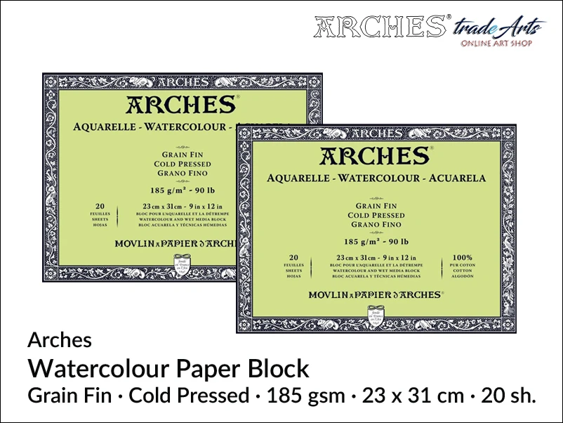 Arches Aquarelle blok akwarelowy drobnoziarnisty prasowany na zimno, 185 gsm, 23 x 31 cm, 20 ark.