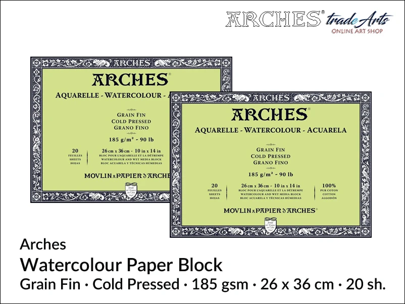 Arches Aquarelle blok akwarelowy drobnoziarnisty prasowany na zimno, 185 gsm, 26 x 36 cm, 20 ark.