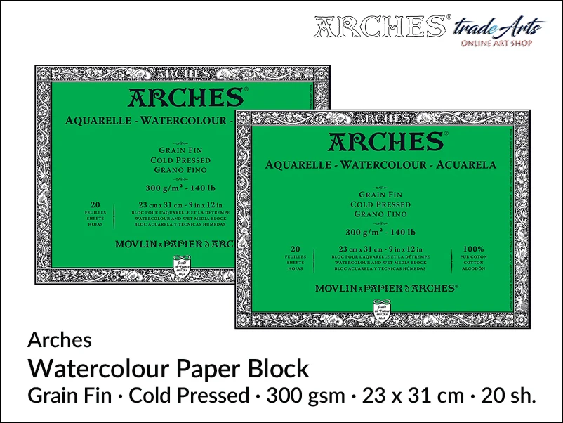 Arches Aquarelle blok akwarelowy drobnoziarnisty prasowany na zimno, 300 gsm, 23 x31 cm, 20 ark.