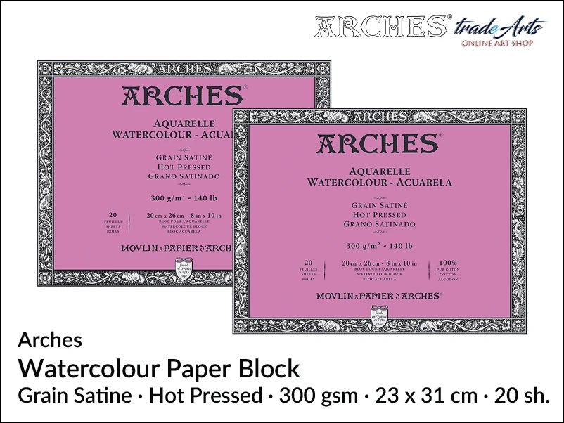 Blok papierowy o naturalnej bieli, ze 100 % bawełny. Włókna bawełniane są mocne i elastyczne, są naturalnie białe i nie zawierają kwasów. Celuloza bawełniana jest również kilkanaście trwalsza niż celuloza drzewna. Papier jest gładki satynowy (Grain Satine, GS) co jest wynikiem zastosowania przy produkcji techniki prasowania na gorąco (Hot Pressed, HP). Ten typ papieru zalecany jest przy stylach precyzyjnych, wymagających pokazania wysokiego poziomu szczegółów. Ułatwia łączenie akwareli z tuszem, zalecany do glazurowania. Jest mniej chłonny niż papier prasowany na zimno (Cold Pressed, CP), łatwiej koryguje się kolory jak i łatwiejsze jest usuwanie farby.