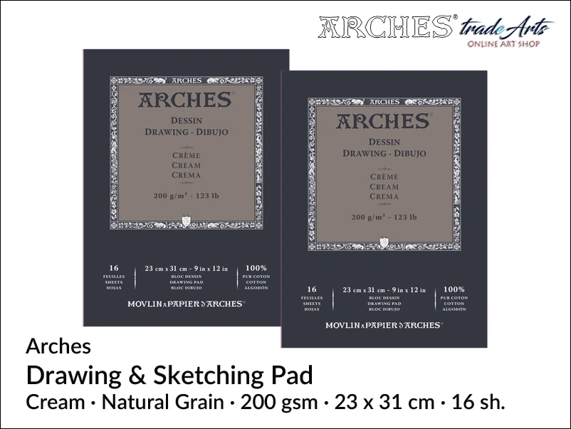 Blok papierowy kremowy drobnoziarnisty, ze 100% bawełny. Włókna bawełniane są mocne i elastyczne, nie zawierają kwasów. Celuloza bawełniana jest również kilkanaście trwalsza niż celuloza drzewna. Idealny do rysunków akademickich. Pozwala artyście bawić się powierzchnią, aby uzyskać efekty reliefowe. Łatwo się ściera, nie pozostawiając śladów ani kłaczków. Papier: Velin d'Arches o bardzo dobrej wytrzymałości mechanicznej. Gładka, chłonna powierzchnia odpowiednia do wszystkich technik graficznych. Z rezerwą alkaliczną (do papieru dodaje się węglan wapnia, aby nadać mu rezerwę alkaliczną, chroniącą go przed atakiem kwasów z otoczenia), bez wybielaczy optycznych.