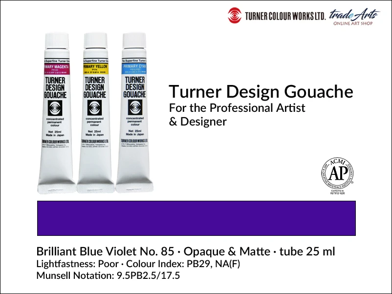 Farba gwaszowa Design Gouache Brilliant Blue Violet 85 zawiera pigmenty: NAF (Paris), PB29 (Polysulfide of Sodium-Alumino Silicate); kryjąca o słabej światłoodporności. Notacja Munsella: 9.5PB2.5/17.5