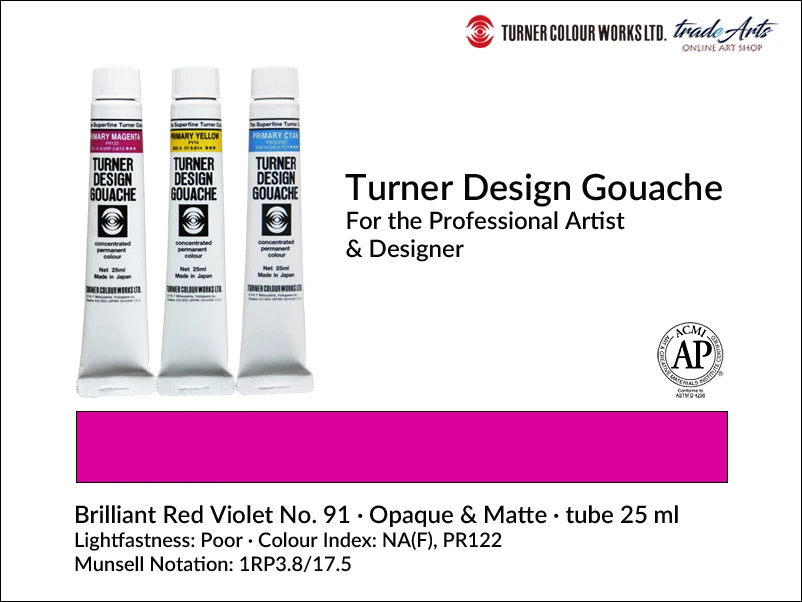 Farba gwaszowa Design Gouache Brilliant Red Violet 91 zawiera pigmenty: NAF (Paris), PR122 (Quinacridone); kryjąca o słabej światłoodporności. Notacja Munsella: 1RP3.8/17.5