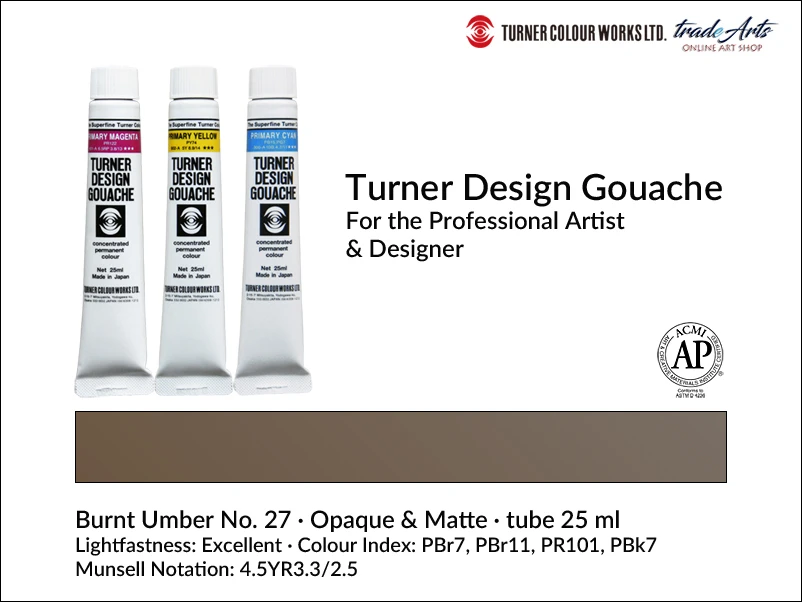 Farba gwaszowa Design Gouache Burnt Umber 27 zawiera pigmenty: PBr7 (Calcined Natural Iron Oxide), PBr11 (Iron Magnesium Oxide), PR101 (Synthetic Red Iron Oxide), PBk7 (Lamp Black); kryjąca o doskonałej światłoodporności. Notacja Munsella: 4.5YR3.3/2.5