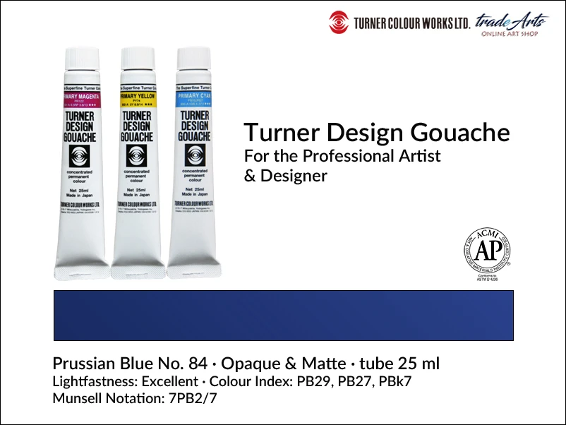 Farba gwaszowa Design Gouache Prussian Blue 84 zawiera pigmenty: PBk7 (Lamp Black), PB27 (Ferriammonium Ferocyanide), PB29 (Polysulfide of Sodium-Alumino Silicate); kryjąca o doskonałej światłoodporności. Notacja Munsella: 7PB2/7