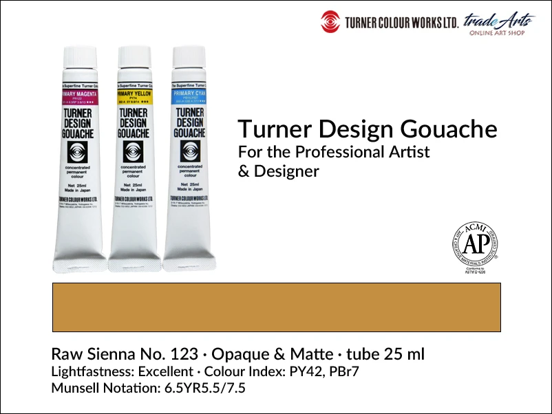 Farba gwaszowa Design Gouache Raw Sienna 123 zawiera pigmenty: PBr7 (Calcined Natural Iron Oxide), PY42 (Synthetic Hydrated Iron Oxide); kryjąca o doskonałej światłoodporności. Notacja Munsella: 6.5YR5.5/7.5