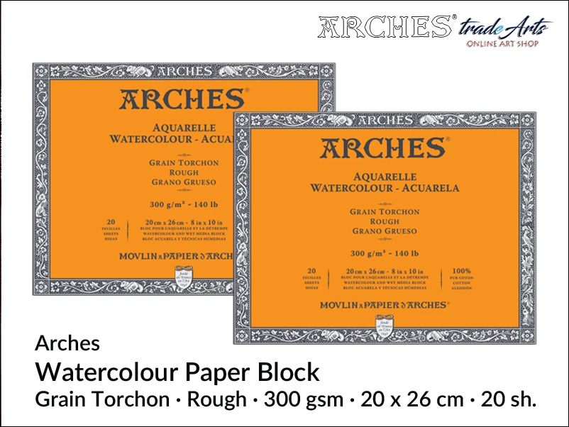 Blok papierowy o naturalnej bieli, ze 100 % bawełny. Włókna bawełniane są mocne i elastyczne, są naturalnie białe i nie zawierają kwasów. Celuloza bawełniana jest również kilkanaście trwalsza niż celuloza drzewna. Papier jest szorstki (Rough, R) o bardzo teksturowanej powierzchni i wyraźnych ząbkach. Pociągnięcia pędzlem są trudniejsze do kontrolowania, a tekstura jest uwydatniona po wyschnięciu farby. Określenie 'torchon' pochodzi z języka francuskiego i oznacza 'gruboziarnistą strukturę'. To specjalna faktura białego papieru podkreślająca trójwymiarowość dzieła.