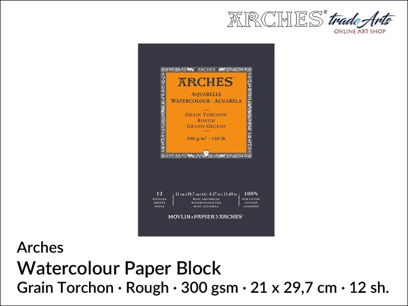 Blok papierowy o naturalnej bieli, ze 100 % bawełny. Włókna bawełniane są mocne i elastyczne, są naturalnie białe i nie zawierają kwasów. Celuloza bawełniana jest również kilkanaście trwalsza niż celuloza drzewna. Papier jest szorstki (Rough, R) o bardzo teksturowanej powierzchni i wyraźnych ząbkach. Pociągnięcia pędzlem są trudniejsze do kontrolowania, a tekstura jest uwydatniona po wyschnięciu farby. Określenie 'torchon' pochodzi z języka francuskiego i oznacza 'gruboziarnistą strukturę'. To specjalna faktura białego papieru podkreślająca trójwymiarowość dzieła.