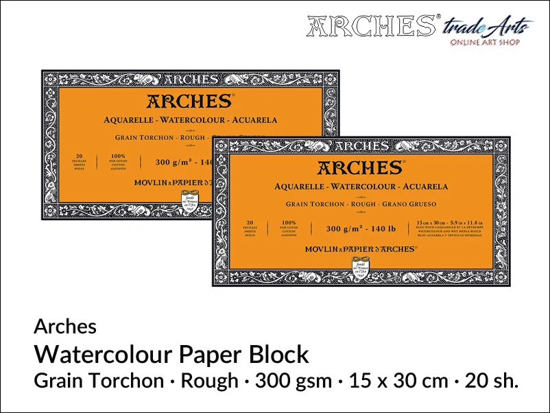Blok papierowy o naturalnej bieli, ze 100 % bawełny. Włókna bawełniane są mocne i elastyczne, są naturalnie białe i nie zawierają kwasów. Celuloza bawełniana jest również kilkanaście trwalsza niż celuloza drzewna. Papier jest szorstki (Rough, R) o bardzo teksturowanej powierzchni i wyraźnych ząbkach. Pociągnięcia pędzlem są trudniejsze do kontrolowania, a tekstura jest uwydatniona po wyschnięciu farby. Określenie 'torchon' pochodzi z języka francuskiego i oznacza 'gruboziarnistą strukturę'. To specjalna faktura białego papieru podkreślająca trójwymiarowość dzieła.
