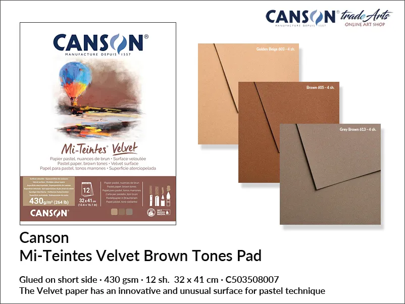 Canson ® Mi-Teintes ® Velvet został specjalnie zaprojektowany dla artystów pastelowych poszukujących wysokiej jakości papieru. To ciężki, bezkwasowy jednostronny papier pastelowy o gramaturze 430 gsm; ma aksamitną powierzchnię skutecznie poprawiającą przyczepność pigmentów. Powierzchnia jest miękka, drobnoziarnista, sugeruje jej zdolność do utrzymywania zarówno drobnych szczegółów, jak i pełnej ekspresji. Pigment jest mocno wchłaniany przez powierzchnię i przez to obraz jest bardzo stabilny.