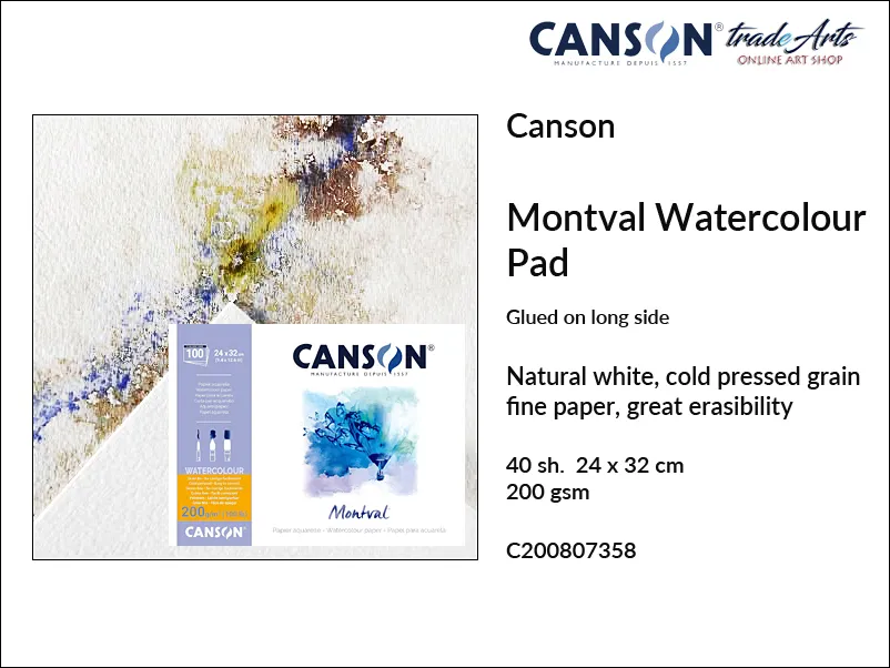 Canson Montval pad do farb akwarelowych klejony na długim boku, tekstura 200 gsm CP, 40 ark. 24 x 32 cm
