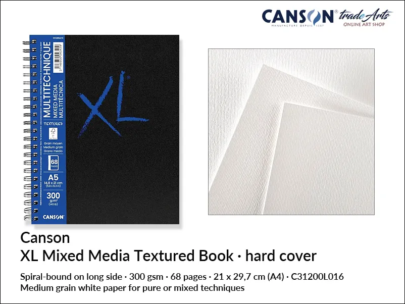 Canson ® XL Mixed Media Textured Book Book zawiera biały, średnioziarnisty papier o gramaturze 300 g/m².