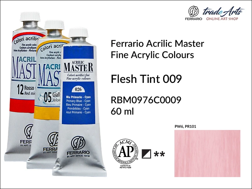 Farby akrylowe Ferrario Acrilic Master - o maksymalnej odporności na działanie światła i połysku. Przylegają perfekcyjnie do podkładu nie pozostawiając śladów pociągnięcia pędzla. Sporządzone z doskonale zmielonych pigmentów połączonych z żywicą akrylową. Farby zaprojektowane zarówno dla zawodowych artystów jak i pasjonatów malarstwa. Gotowe do użycia, doskonale mieszalne ze sobą; rozcieńczalne wodą, mogą być łączone ze wszystkimi dostępnymi mediami akrylowymi. Schną szybko. Trwałe.