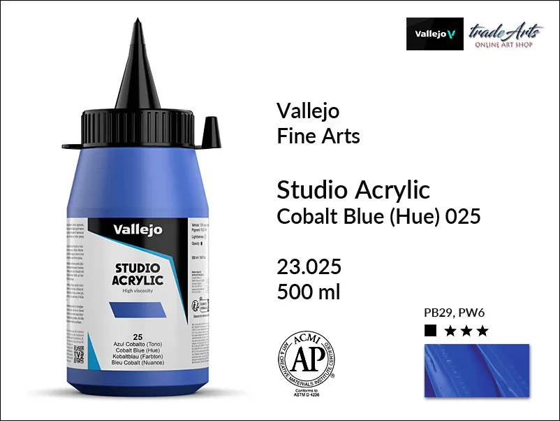 Farba akrylowa Vallejo Acrylic Studio Cobalt Blue imit. No 25 jest kryjąca, zawiera pigment PB29, PW6, światłoodporność wg ASTM: I.