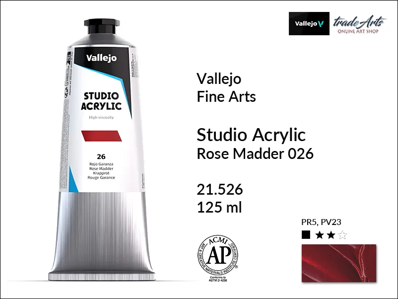 Farba akrylowa Vallejo Acrylic Studio Rose Madder imit. No 26 jest kryjąca, zawiera pigment PR5, PV23, światłoodporność wg ASTM: II.