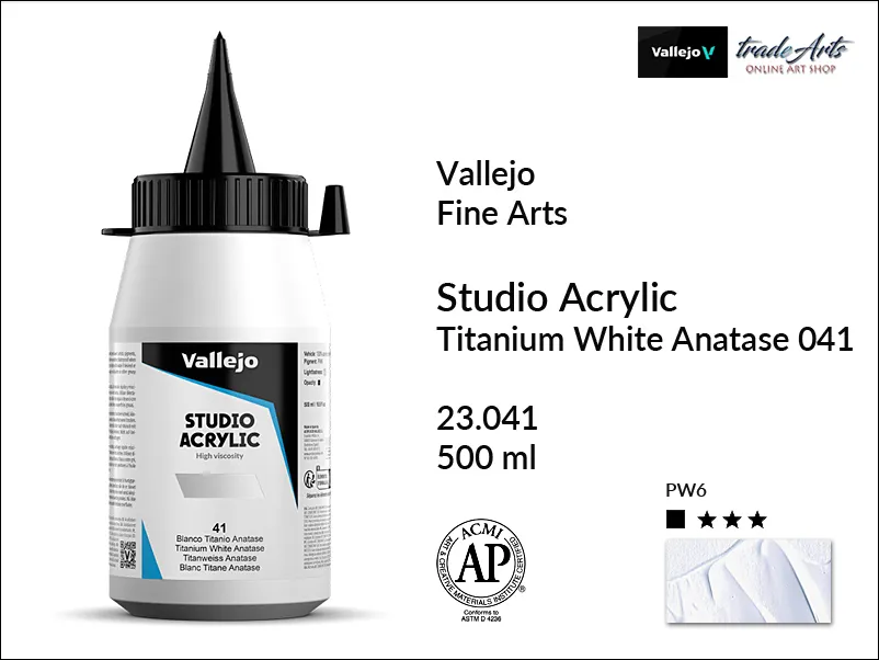 Farba akrylowa Vallejo Acrylic Studio Titanium White Anatase 041 jest kryjąca, zawiera pigment PW6, światłoodporność wg ASTM: I.