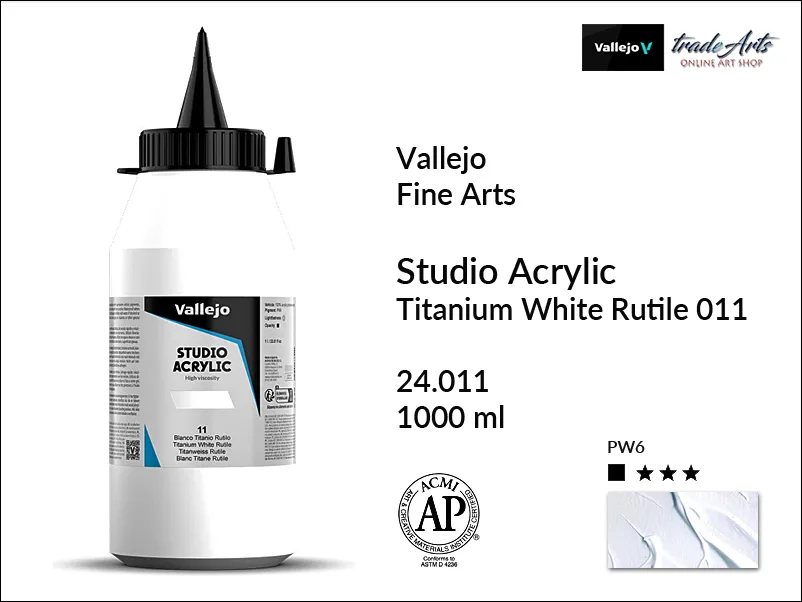 Farba akrylowa Vallejo Acrylic Studio Titanium White Rutile No 11 jest kryjąca, zawiera pigment PW6, światłoodporność wg ASTM: I.