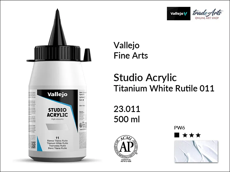 Farba akrylowa Vallejo Acrylic Studio Titanium White Rutile No 11 jest kryjąca, zawiera pigment PW6, światłoodporność wg ASTM: I.