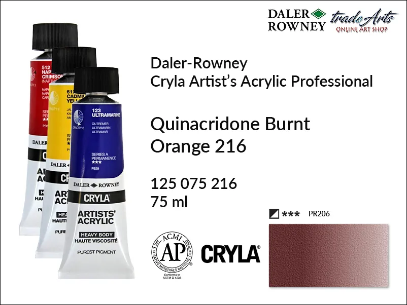 Farba akrylowa Cryla Quinacridone Burnt Orange 216 - sporządzona na bazie pigmentu PR206, półkryjąca, o dobrej światłoodporności, grupa cenowa: C