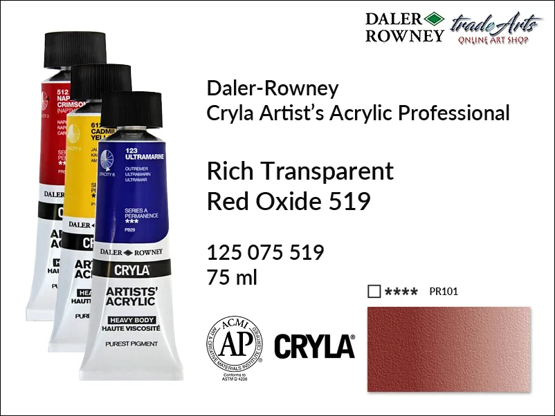Farba akrylowa Cryla Rich Transparent Red Oxide 519 - sporządzona na bazie pigmentu PR101, transparentna, o doskonałej światłoodporności, grupa cenowa: A