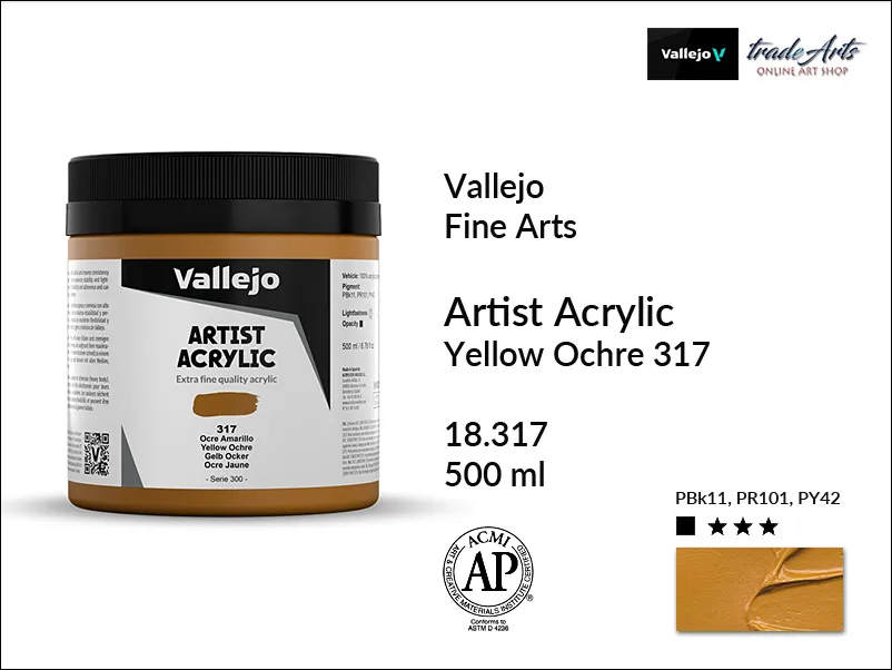 Farba akrylowa Vallejo Acrylic Artist Color, kolor: Yellow Ochre 317, opak. 500 ml