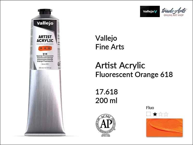 Farba akrylowa fluorescencyjna Vallejo Acrylic Artist Color, kolor: Fluorescent Orange 618, tuba 200 ml