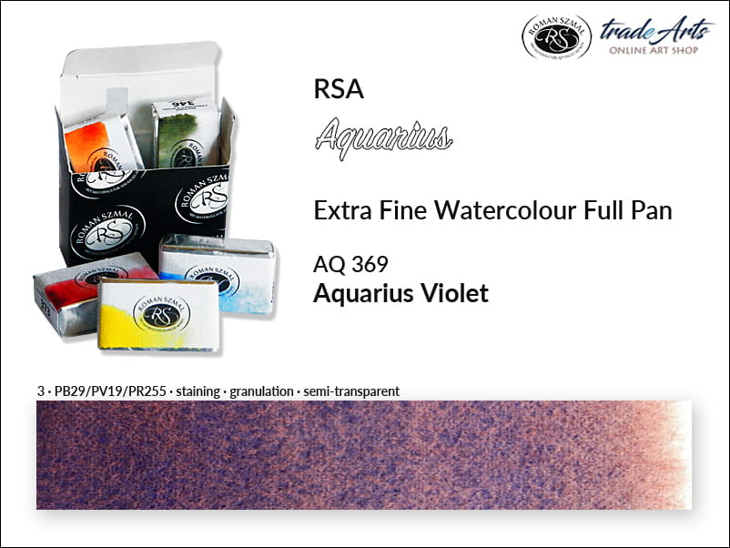 Farba akwarelowa Aquarius Violet 369 powstała na bazie pigmentów PB29, PV19 i PR255, o doskonałej światłoodporności. Jest półprzezroczysta, o trwałym wnikaniu (staining), granuluje. Temperatura barwowa: zimna.