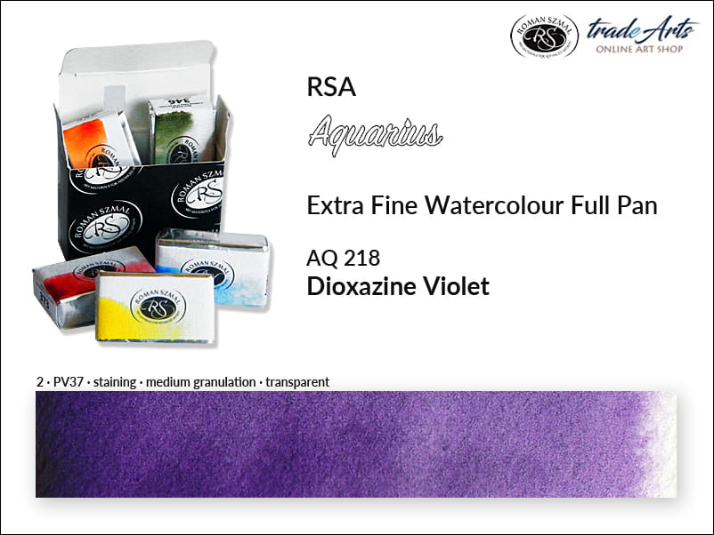 Farba akwarelowa Dioxazine Violet 218 powstała na bazie pigmentu PW7, o doskonałej światłoodporności. Jest przezroczysta, o stałym wnikaniu (staining), średnia granulacja. Temperatura barwowa: zimna.