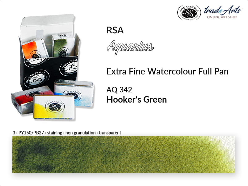 Farba akwarelowa Hooker's Green 342 powstała na bazie pigmentów PY150 i PB27, o doskonałej światłoodporności. Jest przezroczysta, o trwałym wnikaniu (staining), nie granuluje. Temperatura barwowa: ciepła.