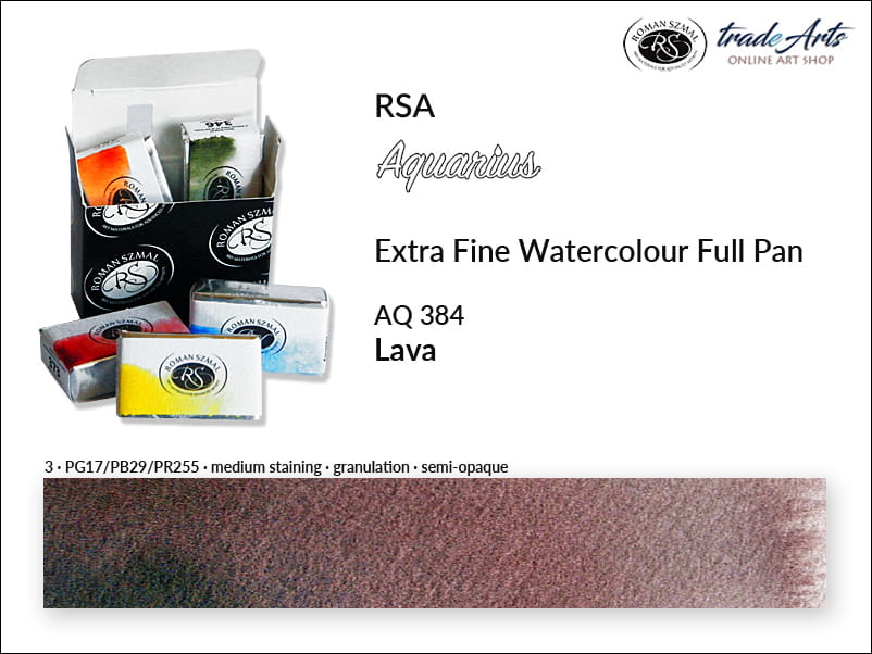 Farba akwarelowa Lava 384 powstała na bazie pigmentów PG17, PB29 i PR255, o doskonałej światłoodporności. Jest półkryjąca, o średnim wnikaniu (staining), granuluje. Temperatura barwowa: zimna.