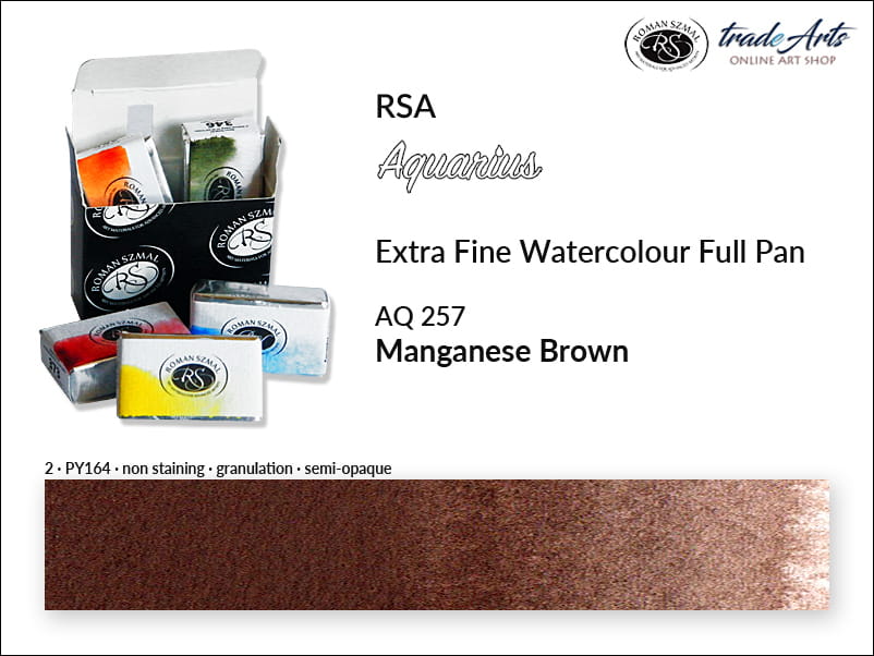 Farba akwarelowa Manganese Brown 257 powstała na bazie pigmentu PY164, o doskonałej światłoodporności. Jest półkryjąca, brak wnikania (staining), granuluje. Temperatura barwowa: bardzo ciepła.