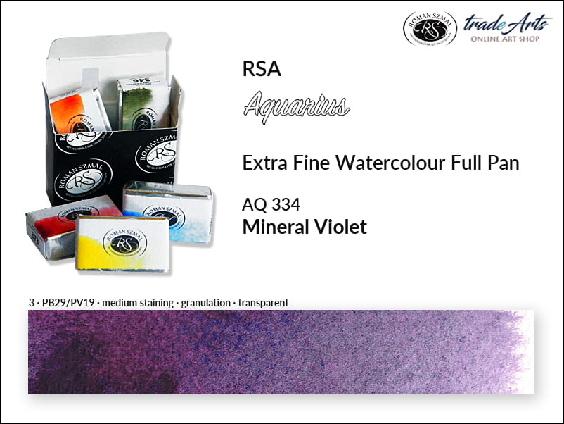 Farba akwarelowa Mineral Violet 334 powstała na bazie pigmentów PB29 i PV16, o doskonałej światłoodporności. Jest przezroczysta, o średnim wnikaniu (staining), granuluje. Temperatura barwowa: zimna.