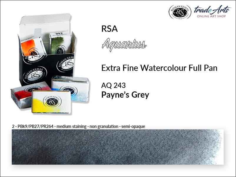 Farba akwarelowa Payne's Grey 243 powstała na bazie pigmentów PBk9, PB27, PR264 o doskonałej światłoodporności. Jest półkryjąca, o średnim wnikaniu (staining), nie granuluje. Temperatura barwowa: bardzo zimna.