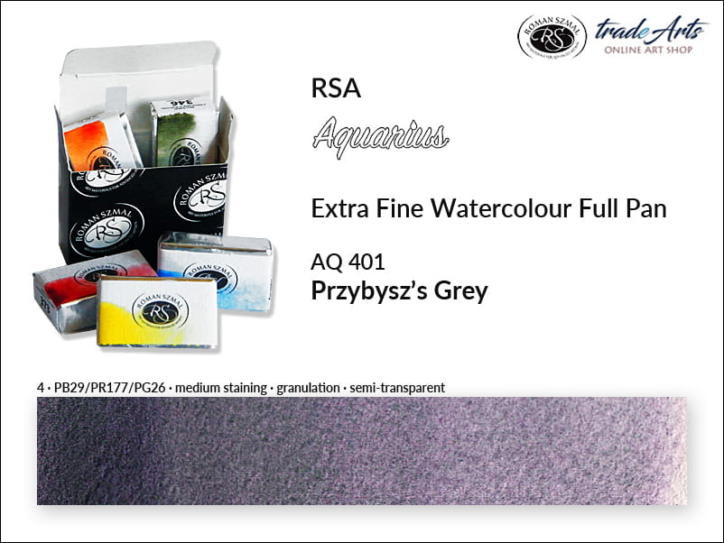 Farba akwarelowa Przybysz's Grey 401 powstała na bazie pigmentów PB29, PR177 i PG26, o doskonałej światłoodporności. Jest półprzezroczysta, o średnim wnikaniu (staining), granuluje. Temperatura barwowa: bardzo zimna.