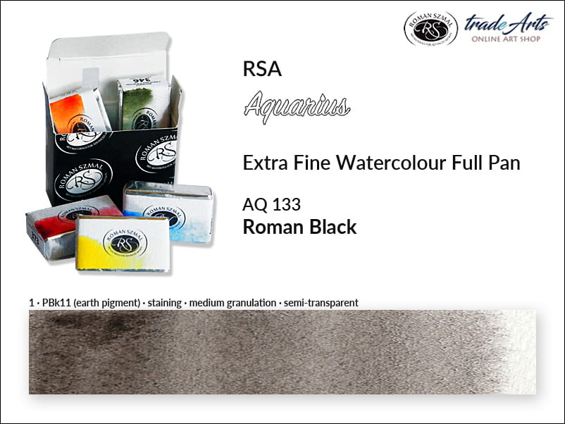 Farba akwarelowa Roman Black 133 powstała na bazie pigmentu PBk11, o doskonałej światłoodporności. Jest półprzezroczysta, o trwałym wnikaniu (staining), średnia granulacja. Temperatura barwowa: bardzo ciepła.