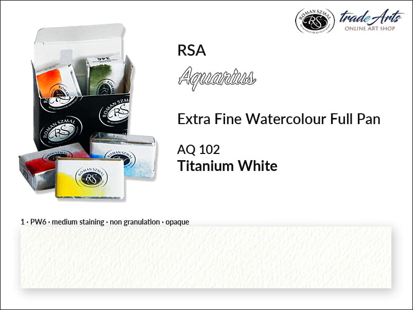 Farba akwarelowa Titanium White 102 powstała na bazie pigmentu PW6, o doskonałej światłoodporności. Jest nieprzezroczysta, o średnim wnikaniu (staining), nie granuluje. Temperatura barwowa: ciepła.