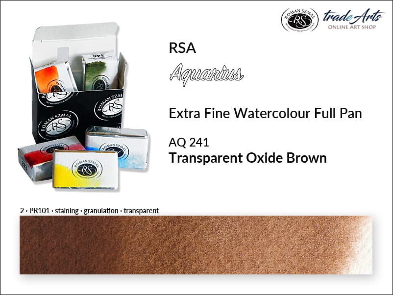 Farba akwarelowa Transparent Oxide Brown 241 powstała na bazie pigmentu PR101, o doskonałej światłoodporności. Jest przezroczysta, o trwałym wnikaniu (staining), granuluje. Temperatura barwowa: bardzo ciepła.